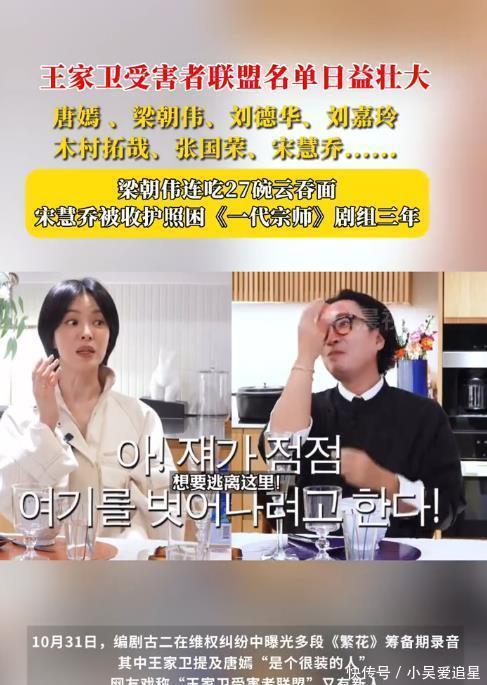 网友迅速将此事关联至经久不衰的“王家卫受害者联盟”话题。这一戏称,指向那些曾与王家卫合作、并深度体验其独特创作方式的演员及幕后人员。其标志性手法包括:长期反复拍摄、临时更改剧本、演员戏份遭遇大量删减等。随着古二的爆料,这份“受害者名单”被再次盘点并扩编:唐嫣、梁朝伟、刘德华、刘嘉玲、木村拓哉、张国荣、宋慧乔等巨星赫然在列。
